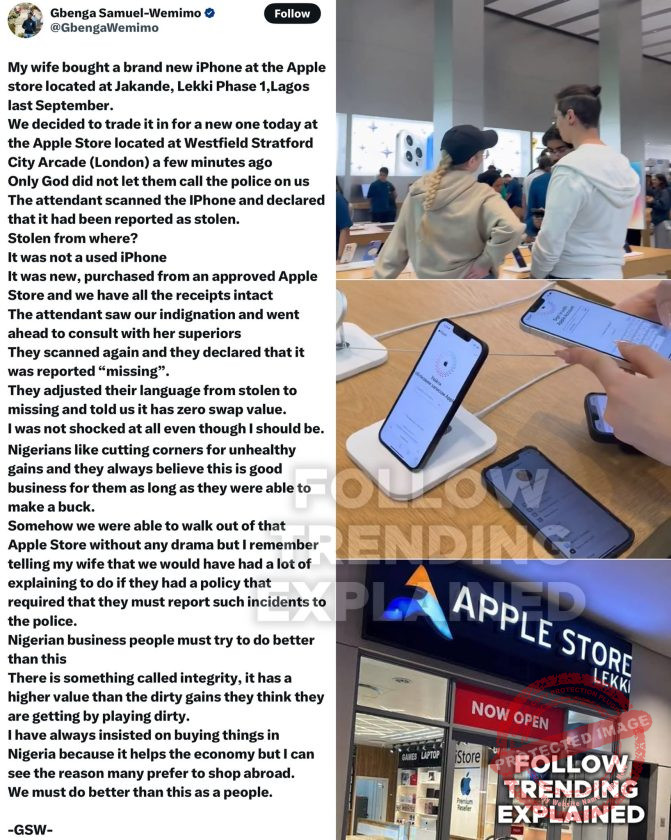 A Nigerian man, Gbenga Samuel Wemimo, has raised alarm after his wife’s brand-new iPhone, allegedly purchased from a supposed official Apple Store in Jakande, Lekki Phase 1, Lagos, was flagged as stolen during a routine trade-in attempt at an Apple outlet in the United Kingdom.