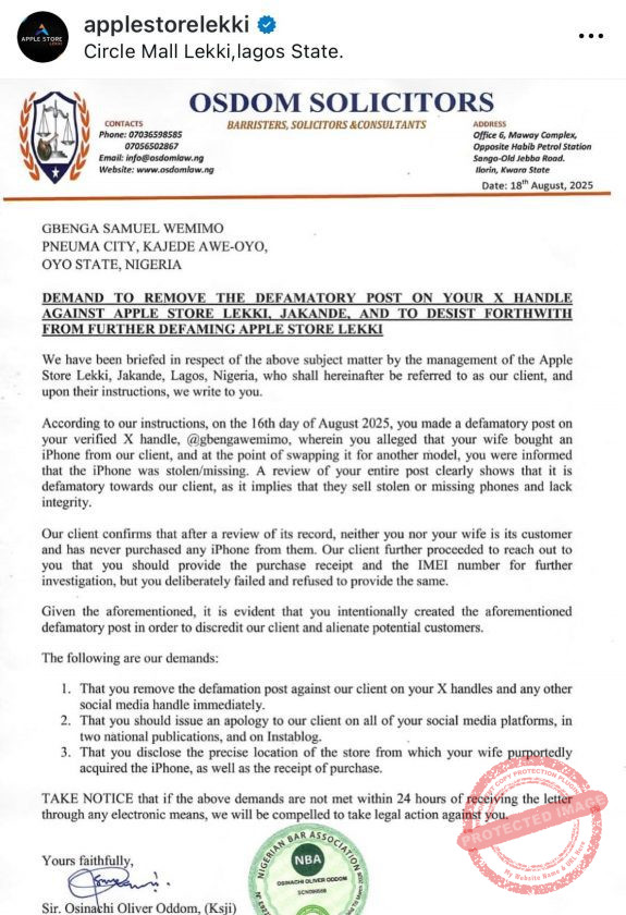 The store demanded that Wemimo take down his post, issue a public apology across major social media platforms and publications, and disclose the actual source of the iPhone, failing which they threatened legal action.